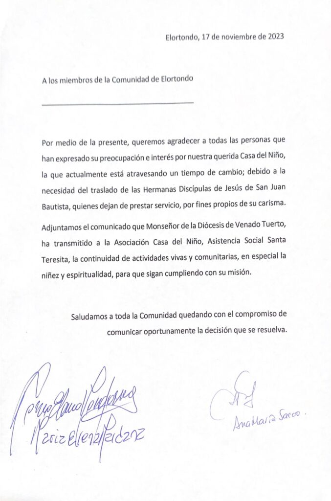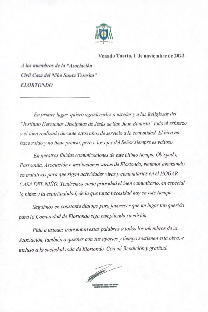 Adjuntamos el comunicado que Monseñor de la Diócesis de Venado Tuerto, ha transmitido a la Asociación Casa del Niño, Asistencia Social Santa Teresita, la continuidad de actividades vivas y comunitarias, en especial la niñez y espiritualidad, para que sigan cumpliendo con su misión.
