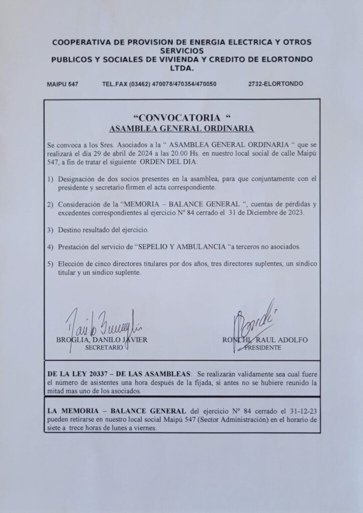 LA MEMORIA – BALANCE GENERAL del ejercicio N° 84 cerrado el 31-12-23 pueden retirarse en nuestro local social Maipú 547 (Sector Administración) en el horario de siete a trece horas de lunes a viernes.