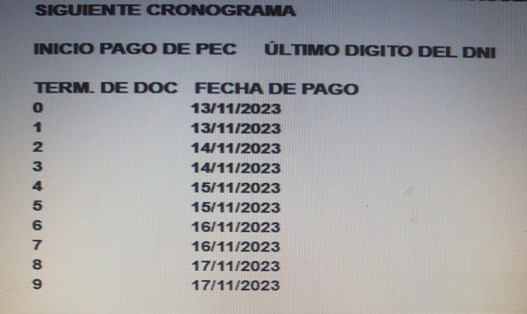 SE PONE EN CONOCIMIENTO EL SIGUIENTE CRONOGRAMA DE PAGOS PARA AUTORIDADES DE MESA Y DELEGADOS DE LAS ÚLTIMAS ELECCIONES DEL 22 DE OCTUBRE DE 2023.