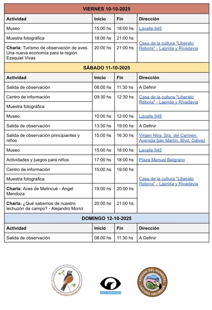 Durante el encuentro habrá salidas de campo, charlas abiertas, muestra fotográfica, recorridos culturales, actividades para niños, feria de artesanos y más propuestas, todas pensadas para compartir y disfrutar de la observación de aves y la riqueza del humedal.