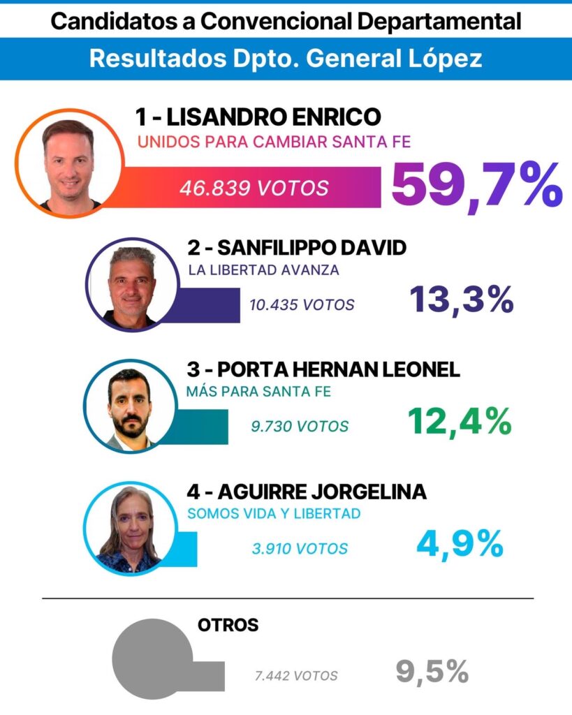 Con un triunfo contundente, Lisandro Enrico se quedó ampliamente con la elección de Convencionales Constituyentes en el departamento General López, logrando una diferencia abrumadora sobre el resto de los candidatos. El actual ministro de Obras Públicas de Santa Fe, y uno de los principales armadores de Unidos para Cambiar Santa Fe, obtuvo el 59,7% de los votos (46.839 sufragios), relegando a sus adversarios a una pelea por el segundo lugar muy lejana.