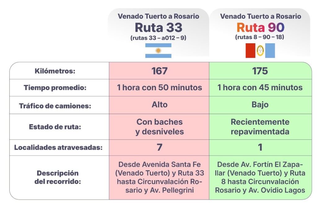 “Hay que empezar a esquivar la 33, y hoy la 90 es la mejor opción para eludir la gran cantidad de camiones, para no tener que atravesar algunos pozos y travesías urbanas que también hay sobre la ruta 14. La alternativa recomendada es la ruta 90, traza que el gobierno provincial viene recuperando con obras, y si bien es cierto que el camino a Rosario se alarga poco más de 15 kilómetros, el recorrido tiene menos tránsito, las condiciones de la carpeta asfáltica están totalmente renovadas y en tiempos de viaje no hay diferencias”, expresó.