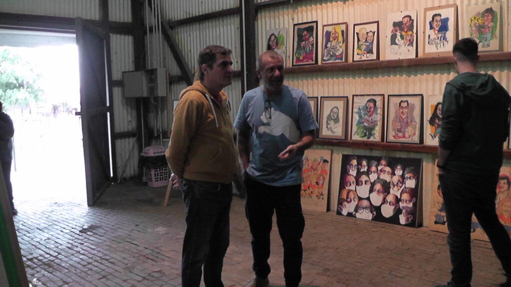 La muestra tuvo como eje central caricaturas en técnica mixta, Seres mitológicos shelknam (Indios anas de Tierra del Fuego) realizamos en tinta china y ténicas puntillismo.