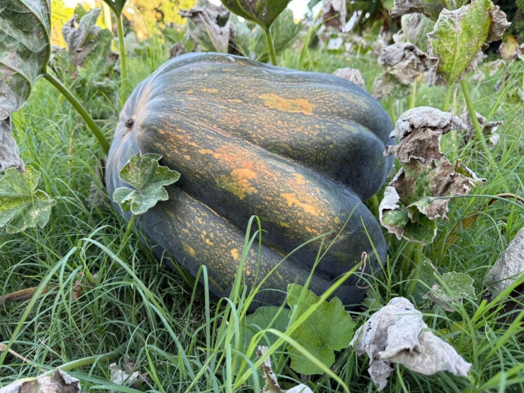 Algunas de estas calabazas ya pesan más de 15 kilos, un tamaño que impresiona aún más al verlas junto a Delfina, una nena de apenas 3 años que apenas supera en altura y peso a estos frutos increíbles.